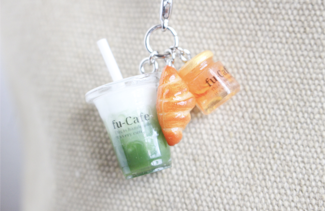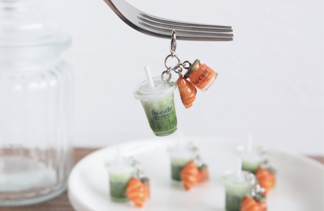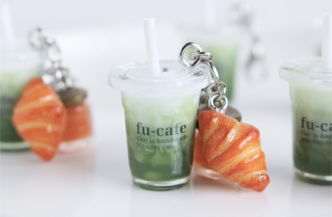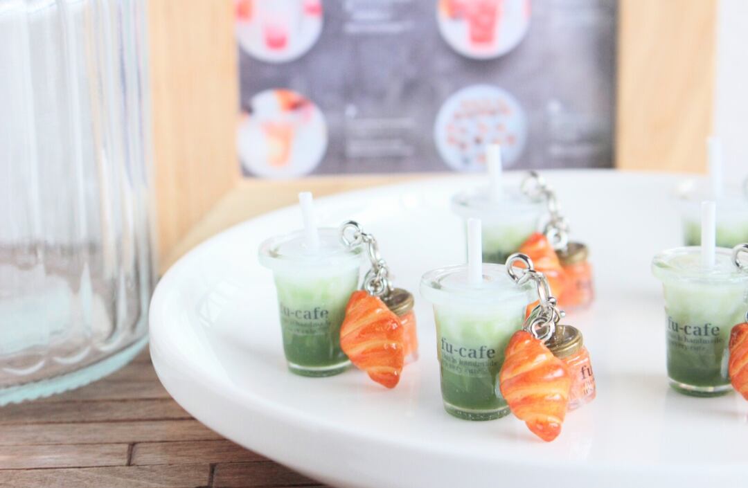 まるで本物のカフェから出てきたようなリアルな抹茶オレとママレードジャムとクロワッサンのチャームを作りました♡