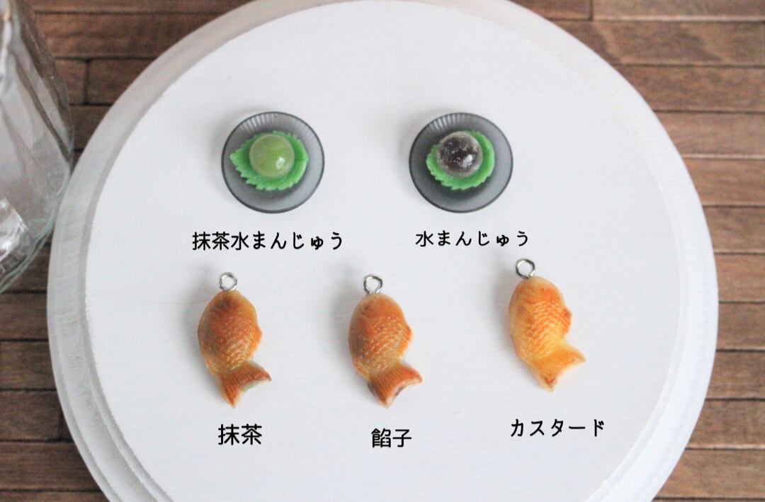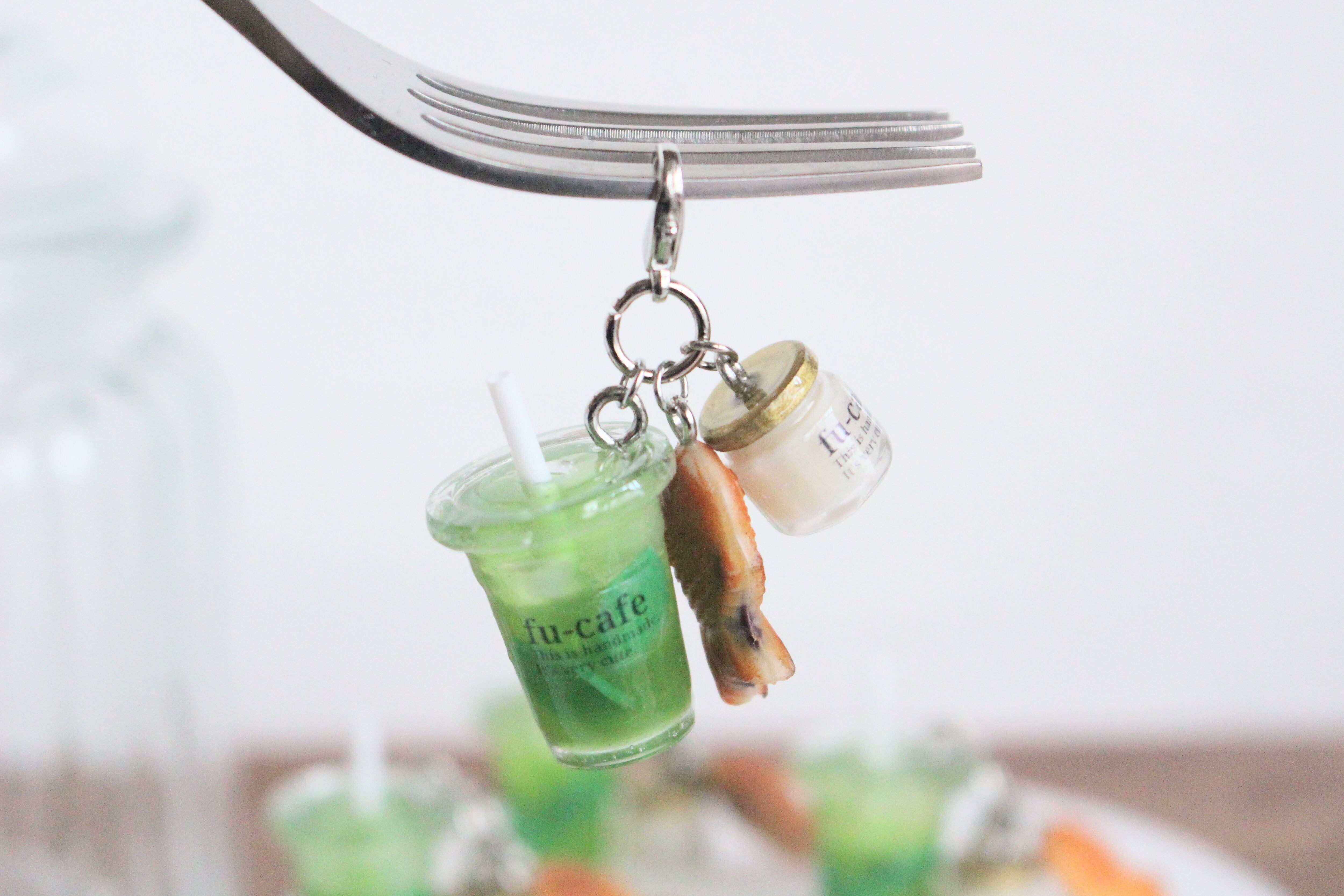 まるで本物のカフェから出てきたようなリアルな冷たい緑茶とスイーツのチャームのチャームを作りました♡