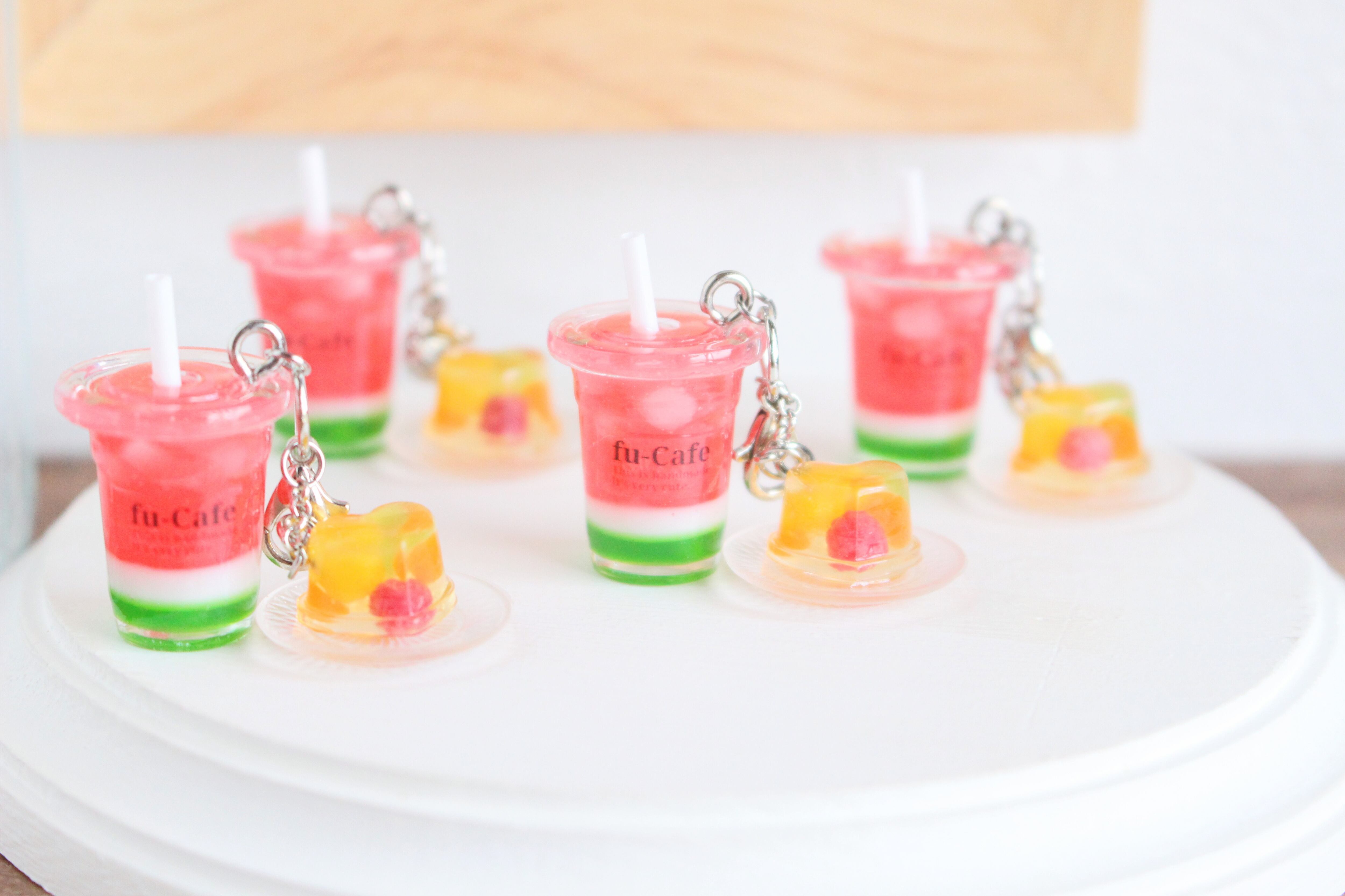 まるで本物のカフェから出てきたようなリアルなスイカメロンクリームソーダとフルーツたっぷりゼリーのチャームを作りました♡