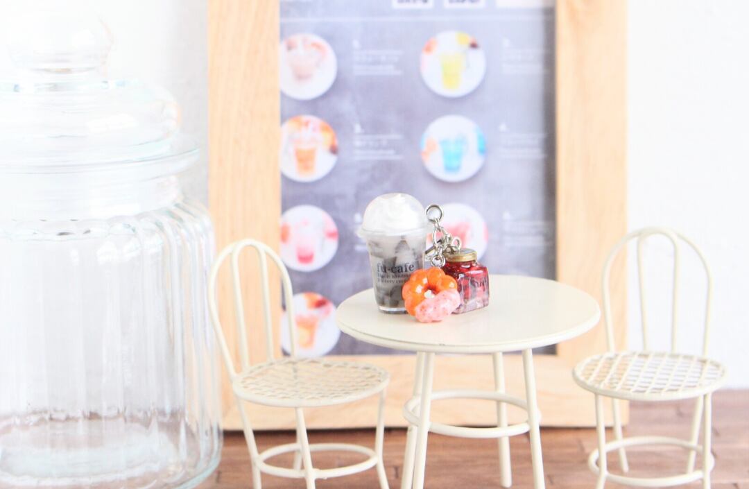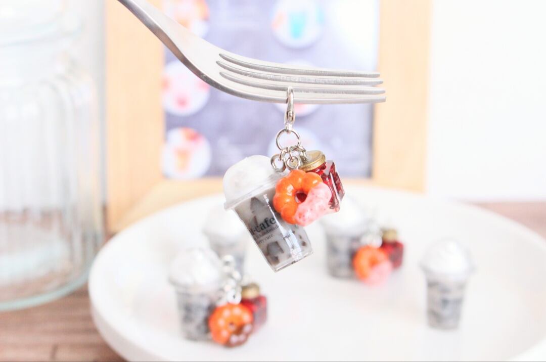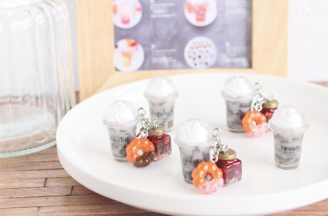 まるで本物のカフェから出てきたようなリアルなカフェゼリーフラッペといちごジャムとドーナツのチャームを作りました♡