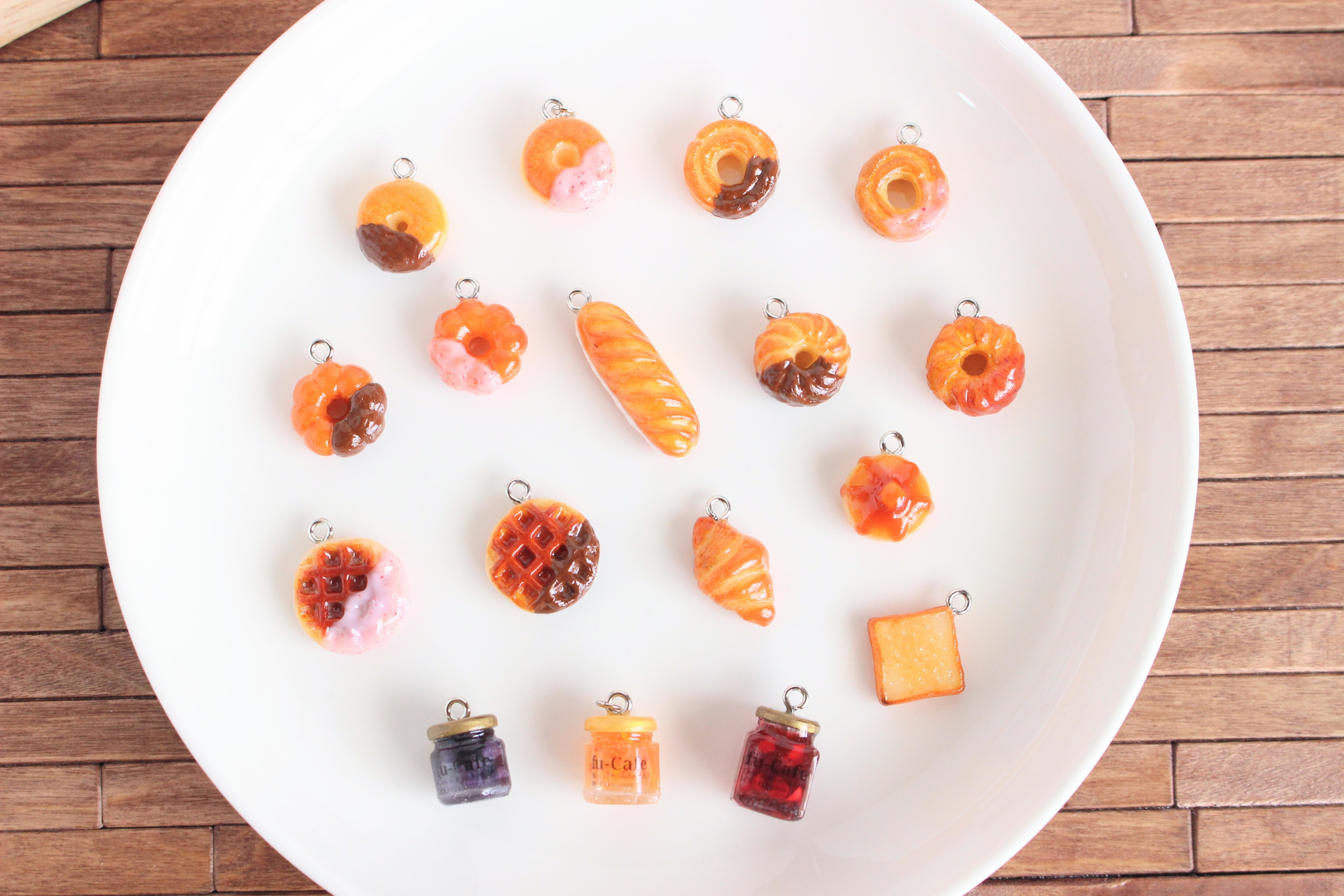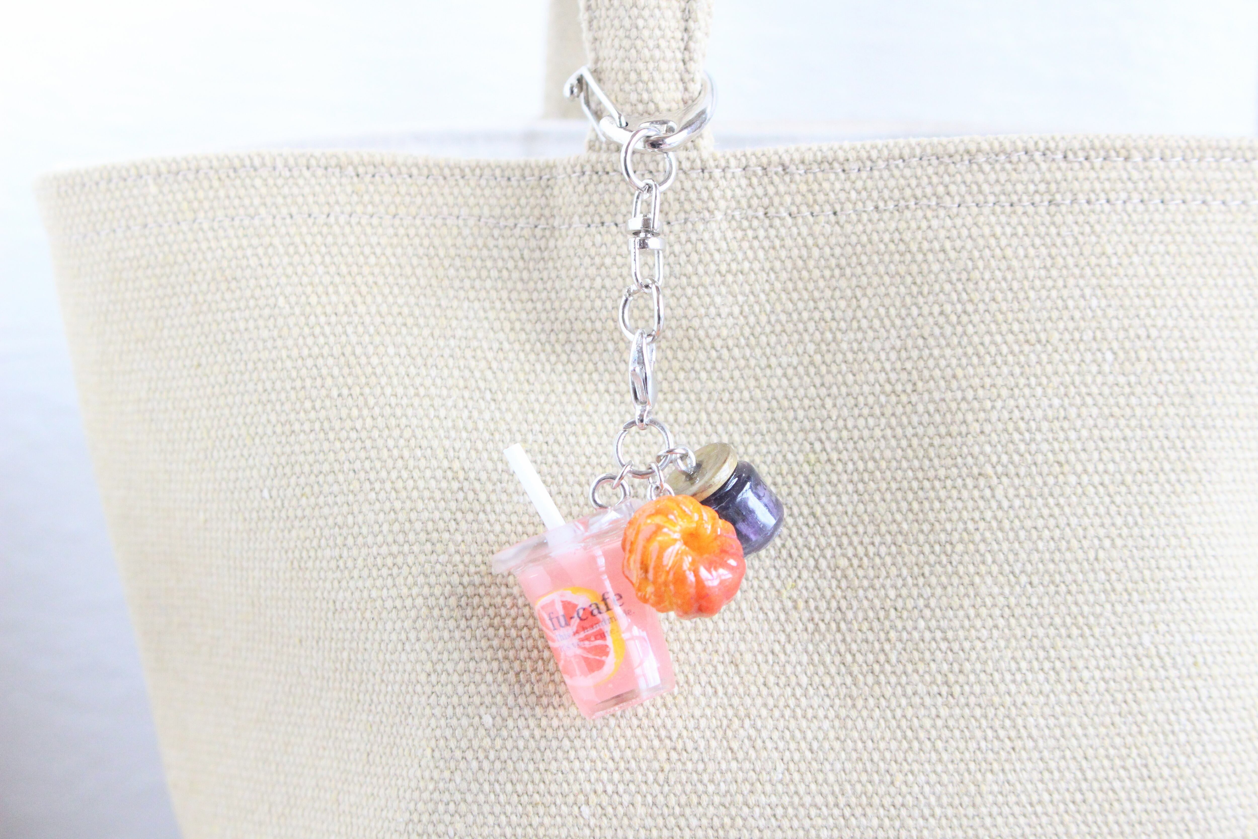 まるで本物のカフェから出てきたようなリアルなピングレジュースとブルーベリージャムとドーナツのチャームを作りました♡
