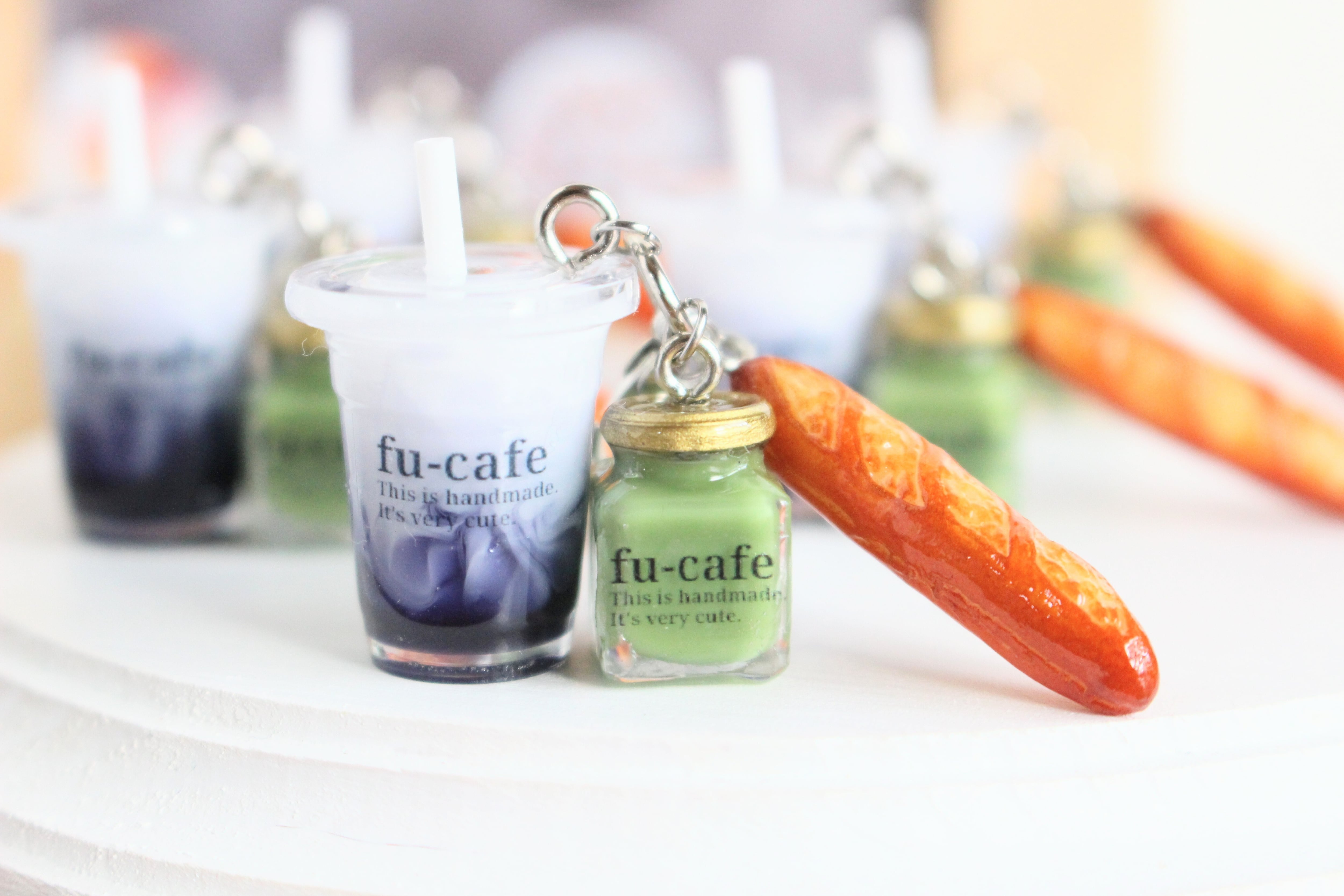 まるで本物のカフェから出てきたようなリアルなブルーベリーオレと抹茶クリームとフランスパンのチャームを作りました♡