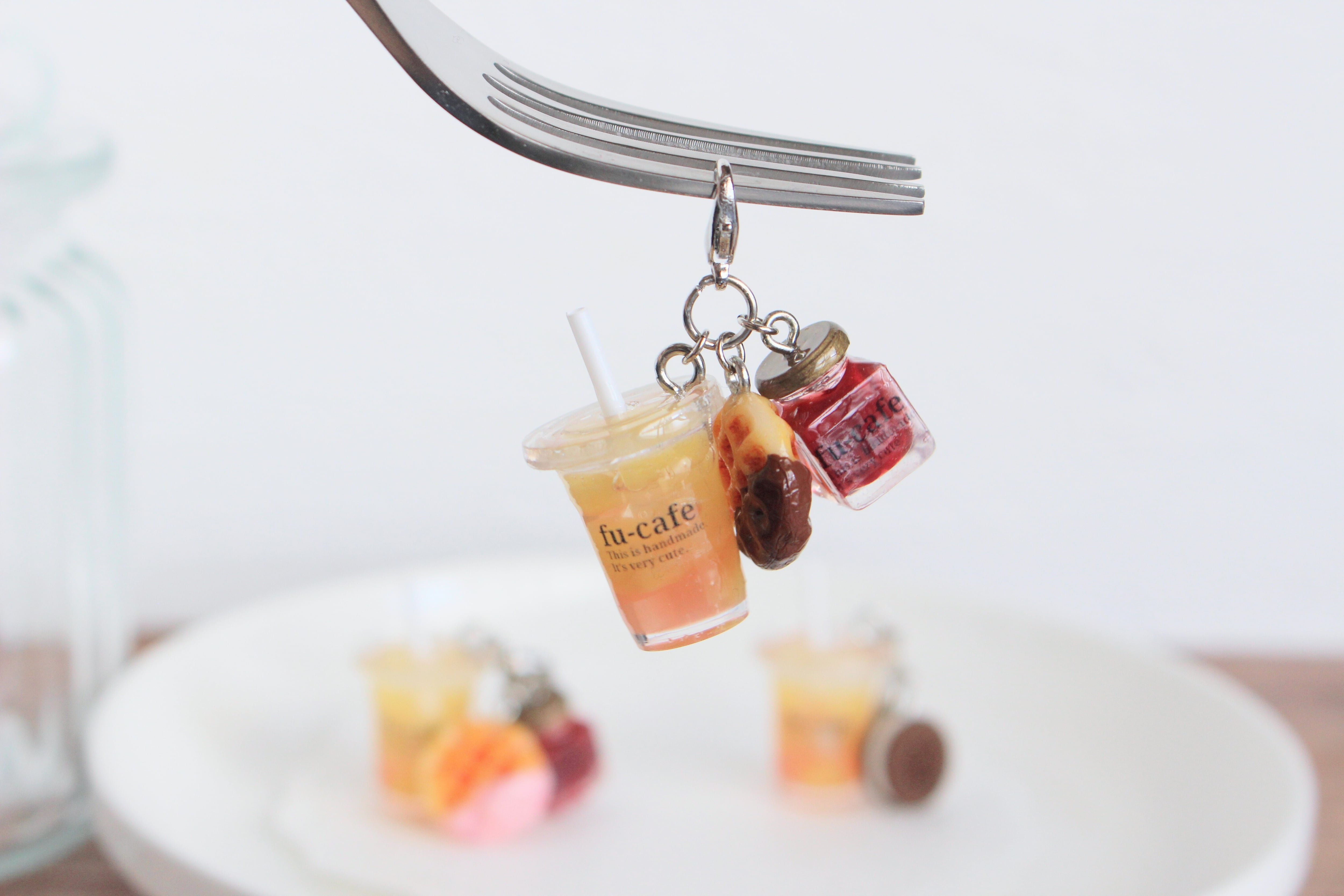 まるで本物のカフェから出てきたようなリアルなパインジュースといちごジャムとワッフルのチャームを作りました♡