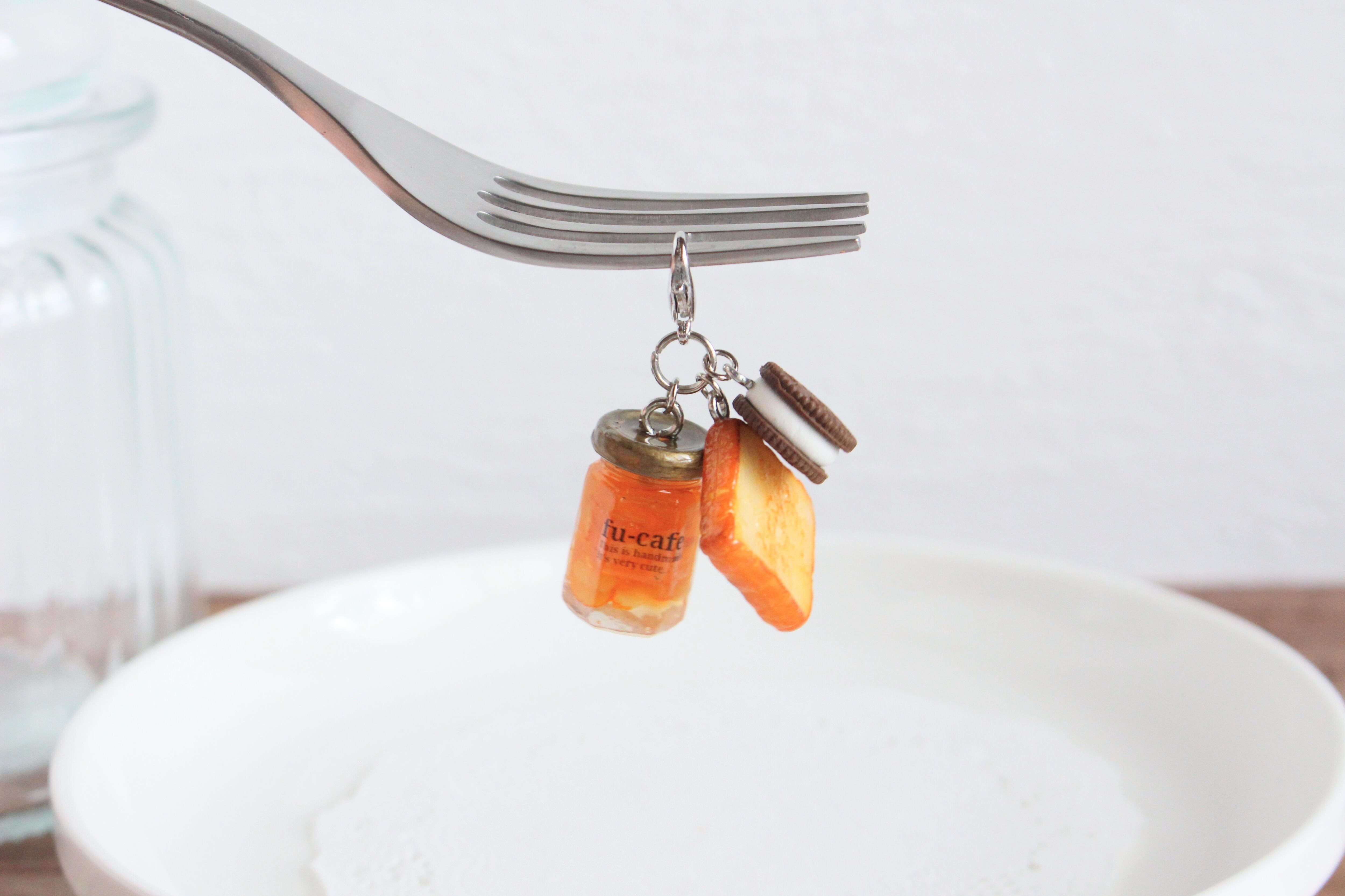 まるで本物のカフェから出てきたようなリアルなママレードジャムとクッキーサンドアイスとトーストのチャームを作りました♡