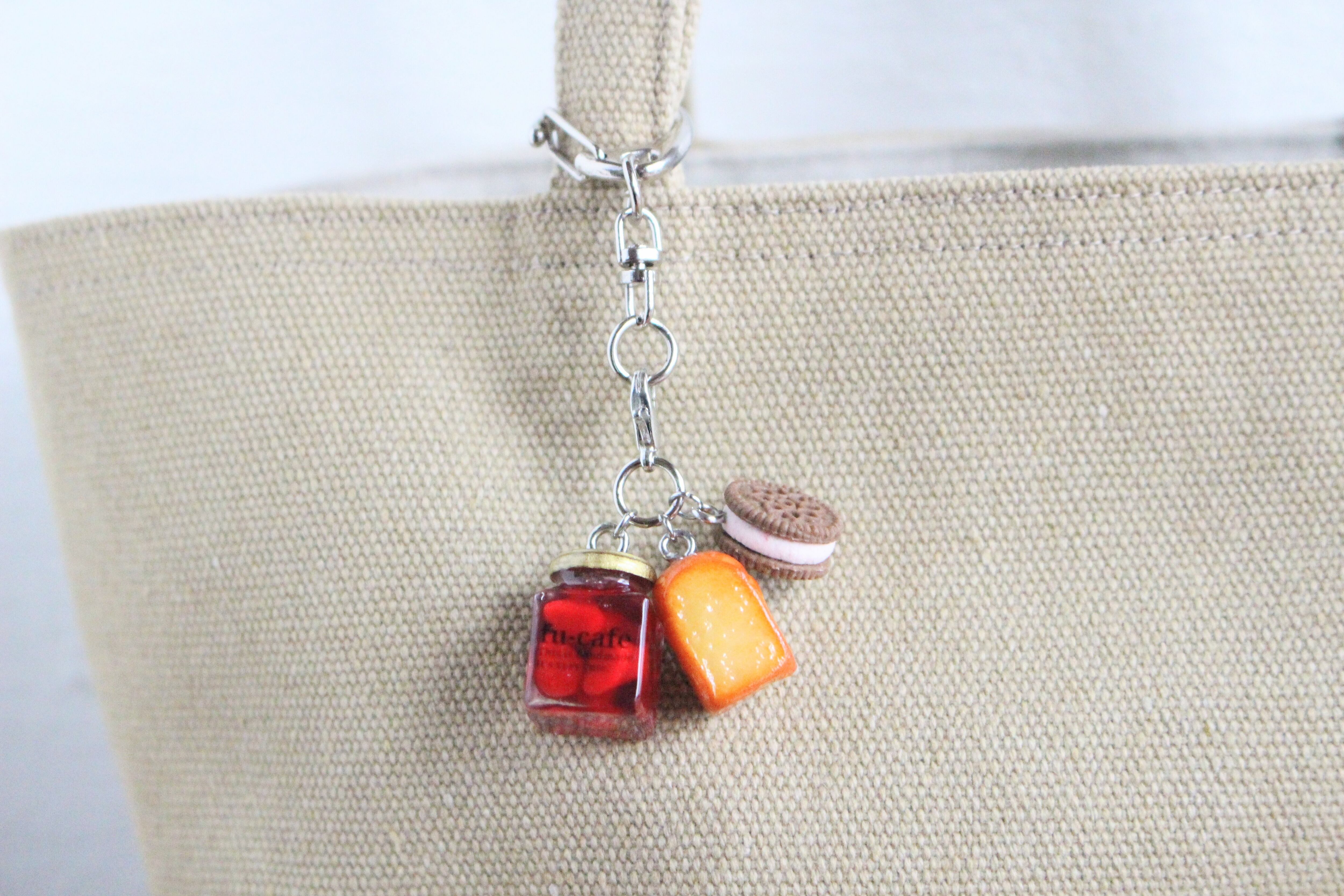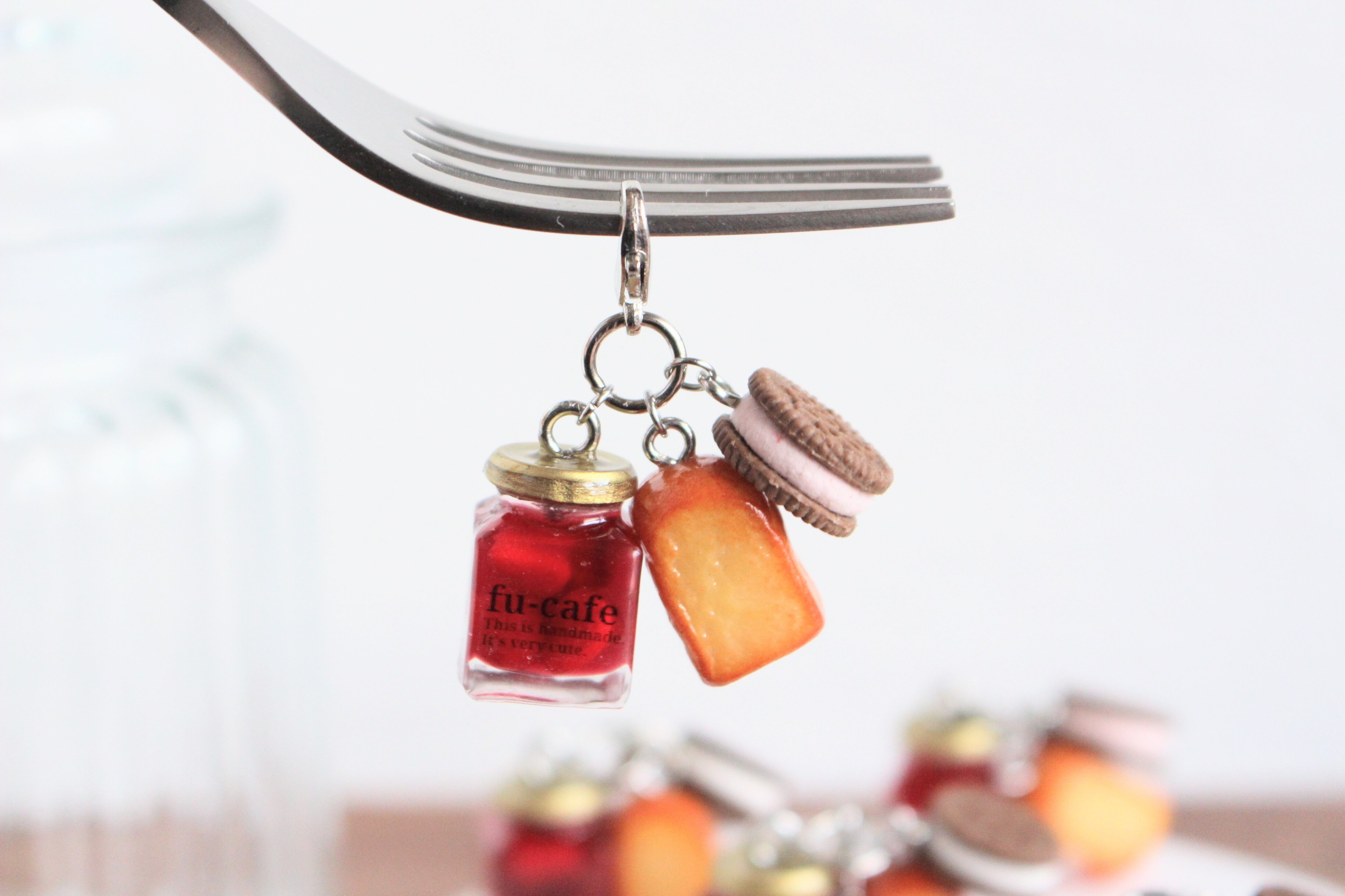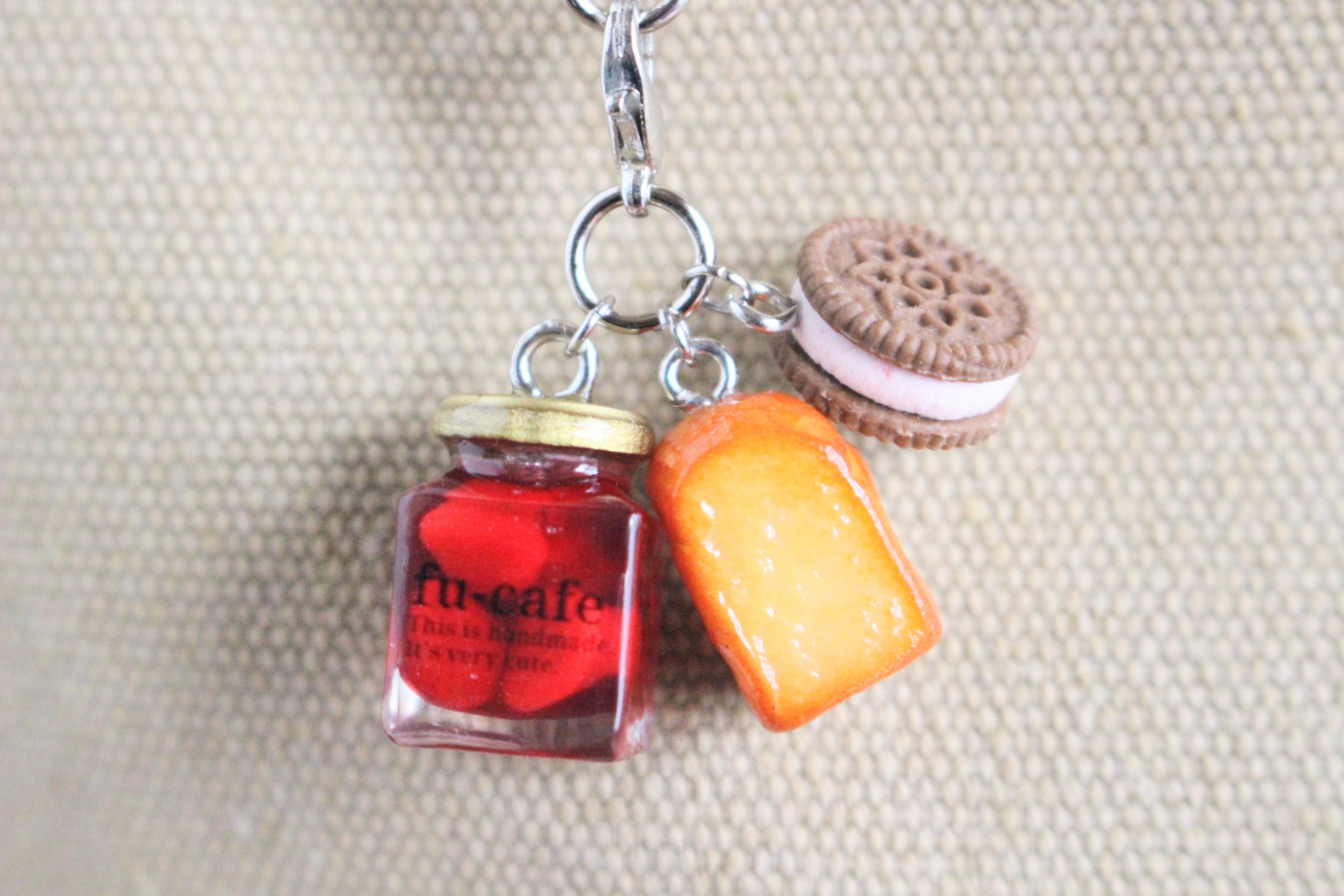 まるで本物のカフェから出てきたようなリアルなまるごといちごジャムとクッキーサンドアイスとトーストのチャームを作りました♡